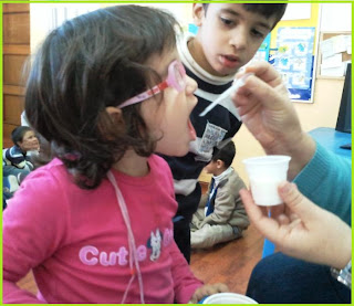 Para cheirar, provar e adivinhar, tivemos o doce e o salgado ( açucar e sal), o ácido (limão), o amargo (café) e muitos outros aromas e sabores (água, leite simples e com chocolate, sumo, canela, caril, cravinho,  açafrão e alho).